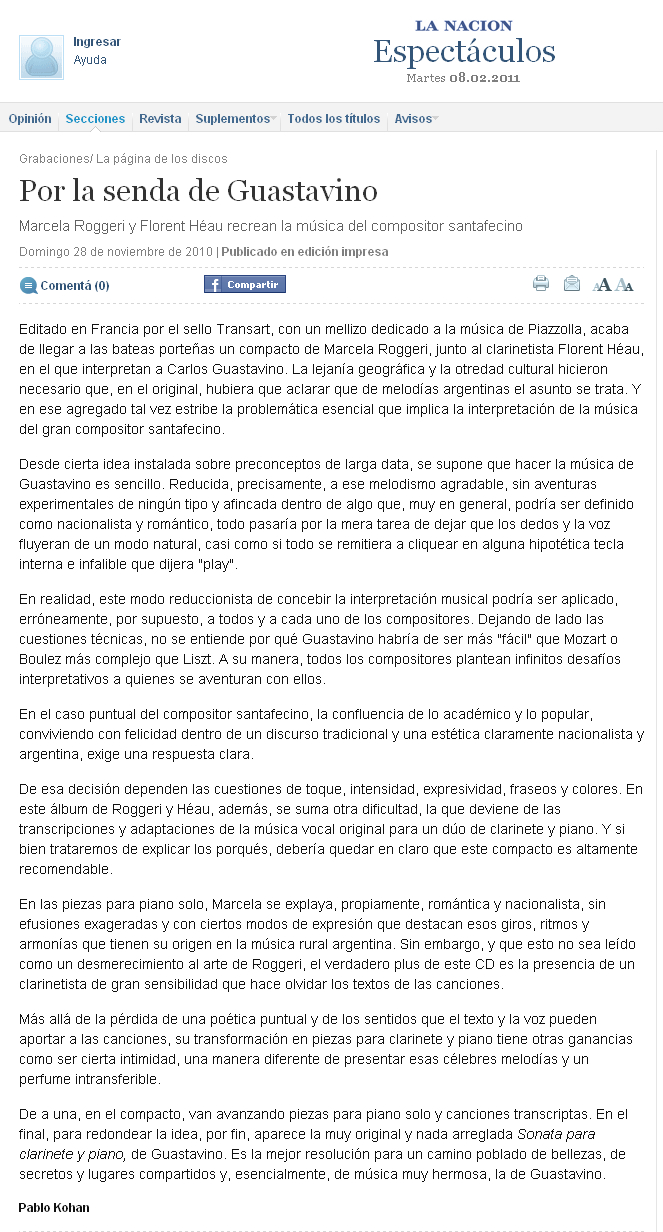 Soy una real entusiasta. Siempre he incluido compositores argentinos en mis presentaciones, desde los más históricos hasta Pablo Aguirre, Esteban Benzecry y otros de la nueva generación. Hay música muy interesante en la Argentina hoy día, siempre partiendo de la música tradicional, como lo ha hecho Osvaldo Golijov. Hacer llegar esa música nuestra a la mayor parte de gente posible es una de las mejores maneras de hacer patria.