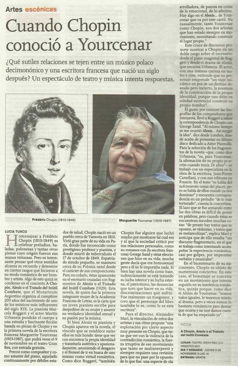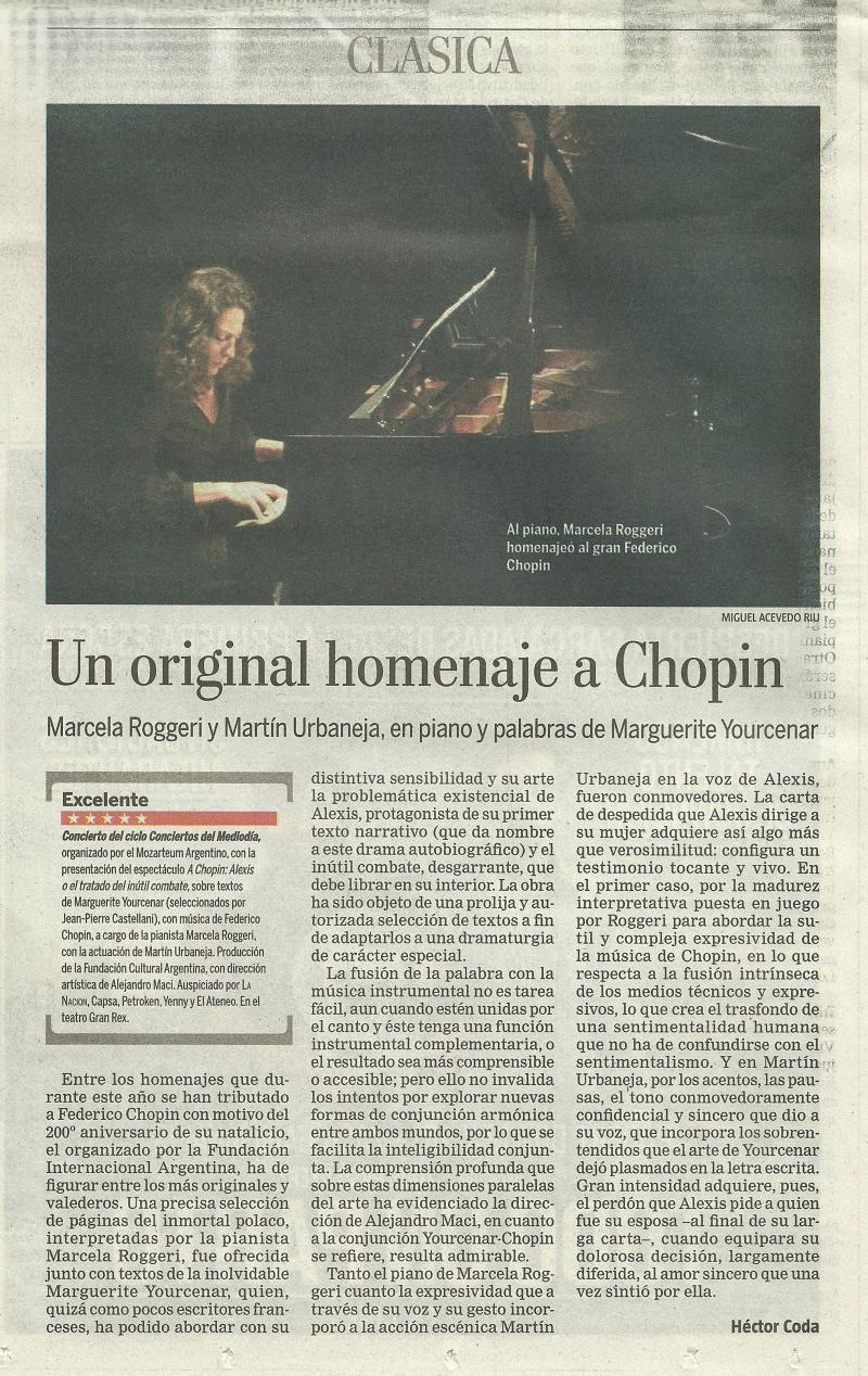 Crítica de la Revista Eñe (Clarín) al espectáculo en el cual la pianista Marcela Roggeri y el actor Martín Urbaneja dieron cuerpo a una extraña y fascinante ficción basada en piezas de Chopin y en la primera novela de la escritora francesa Marguerite Yourcenar (1903-1987), que pudo verse el 9 de noviembre en el teatro Gran Rex.