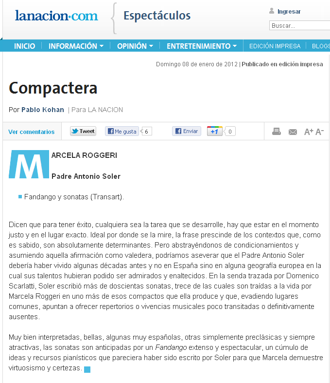Muy bien interpretadas, bellas, algunas muy españolas, otras simplemente preclásicas y siempre atractivas, las sonatas son anticipadas por un Fandango extenso y espectacular, un cúmulo de ideas y recursos pianísticos que pareciera haber sido escrito por Soler para que Marcela demuestre virtuosismo y certezas.
