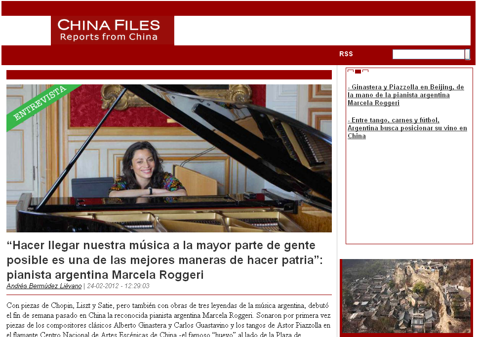 Con piezas de Chopin, Liszt y Satie, pero también con obras de tres leyendas de la música argentina, debutó el fin de semana pasado en China la reconocida pianista argentina Marcela Roggeri. Sonaron por primera vez piezas de los compositores clásicos Alberto Ginastera y Carlos Guastavino y los tangos de Astor Piazzolla en el flamante Centro Nacional de Artes Escénicas de China -el famoso “huevo” al lado de la Plaza de Tiananmen- en Beijing. China Files conversó con Marcela Roggeri después del concierto.