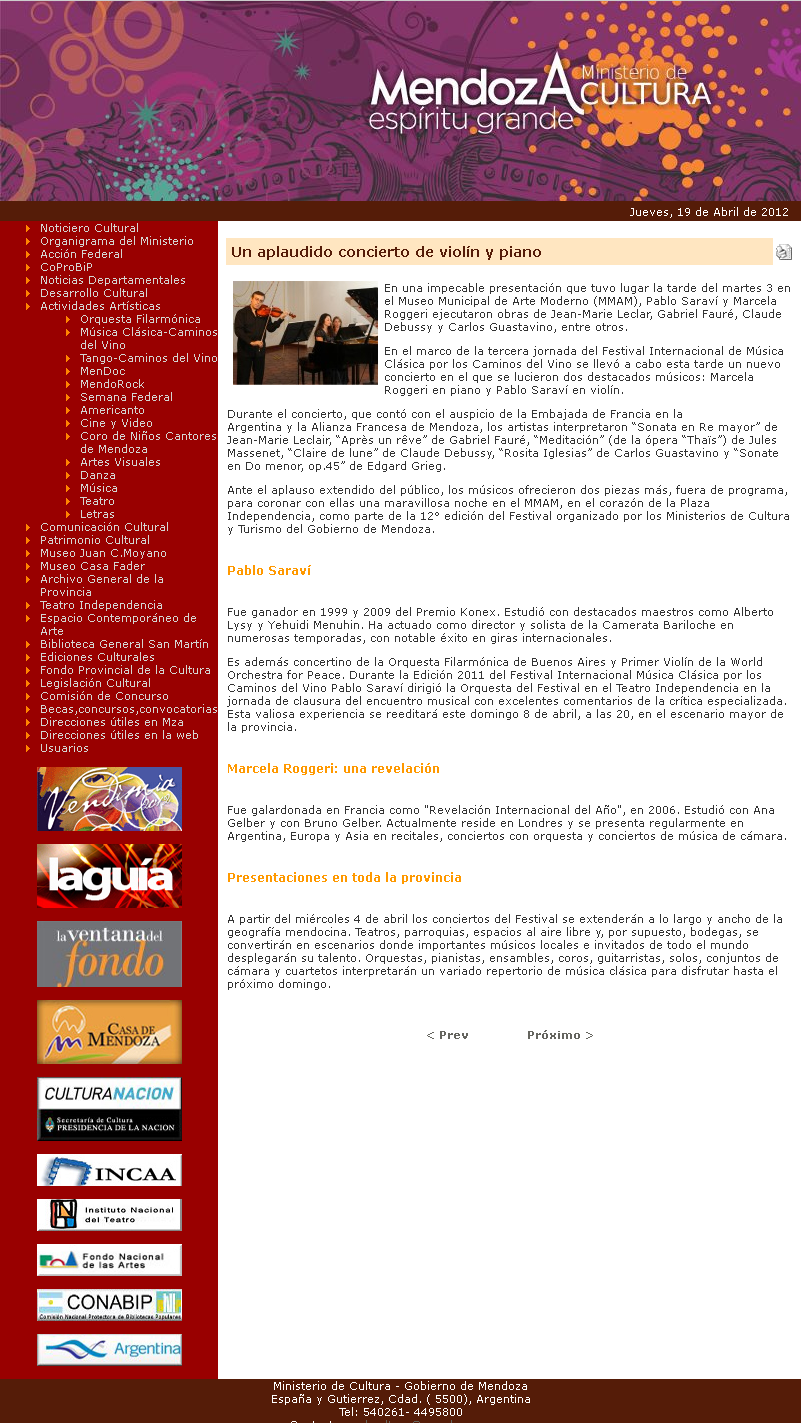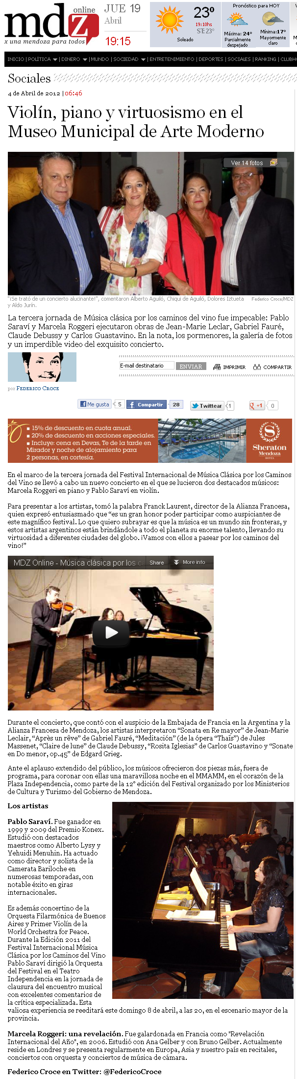 En una impecable presentación que tuvo lugar la tarde del martes 3 en el Museo Municipal de Arte Moderno (MMAM), Pablo Saravi y Marcela Roggeri ejecutaron obras de Jean-Marie Leclar, Gabriel Fauré, Claude Debussy y Carlos Guastavino, entre otros.