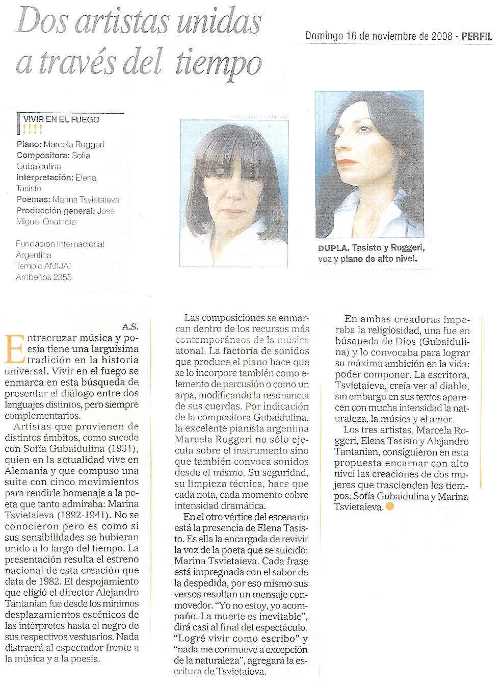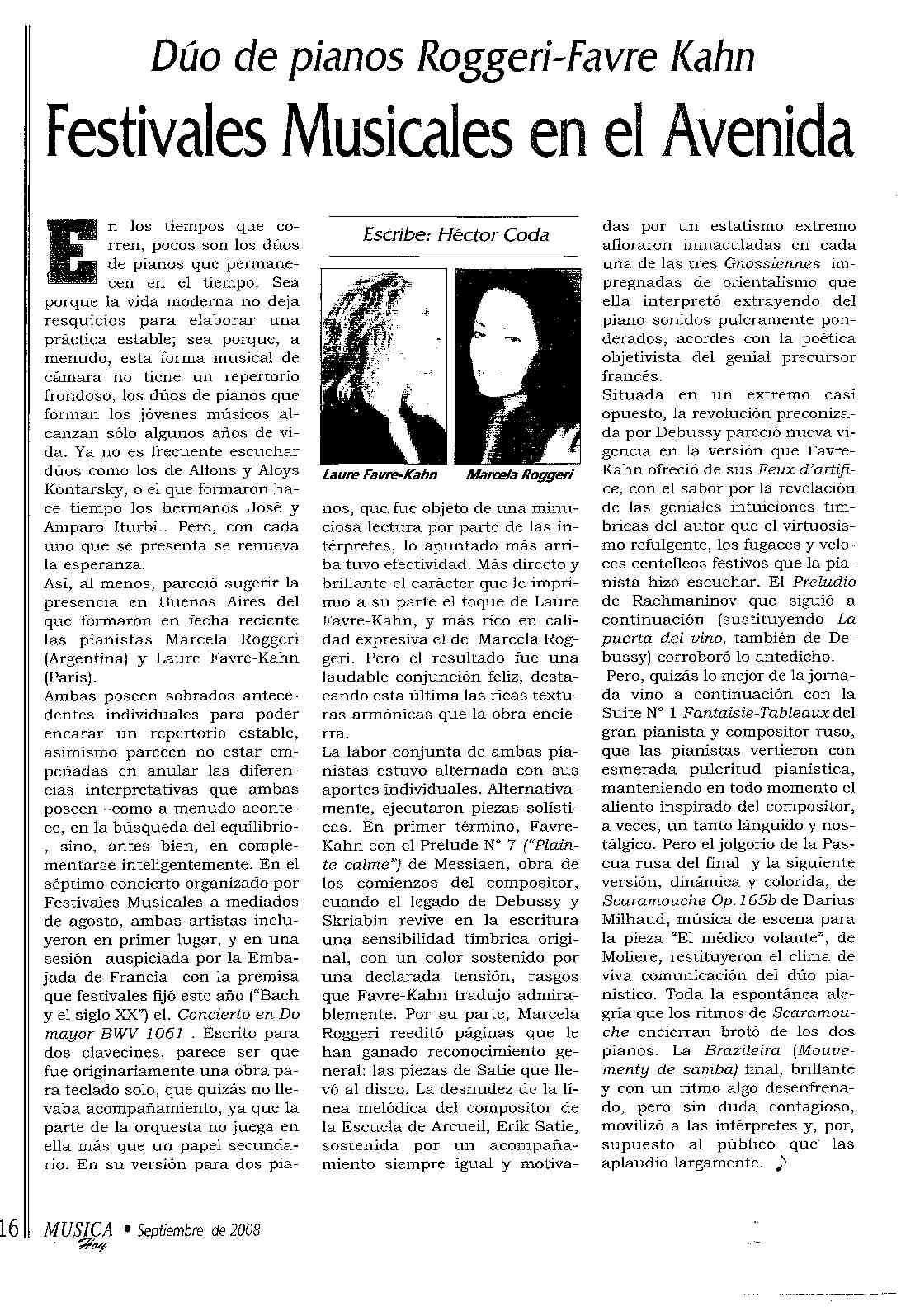 Aunque Marcela Roggeri no es una especialista en música de cámara, formó un dúo armónico con Pablo Saraví. La energía de la pianista y la meticulosidad del violinista se asociaron para brindar una sentida versión de la Sonata 3 en Do menor op. 45 de Edvard Grieg. El violín marcaba sus frases y le contestaba el piano con un sentido romanticismo. Roggieri es una pianista de sonidos puros y limpios; es su obsesión cuando ensaya, como buena discípula de Ana Gelber. Saraví conoce todo lo que el violín puede dar en la estructurada música de cámara.