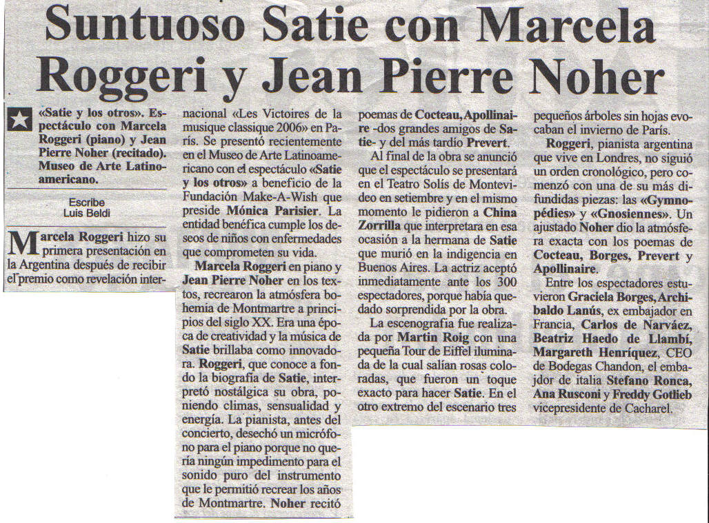 "Satie y los otros", con la pianista Marcela Roggeri y el actor Jean Pierre Noher, combina la música del compositor francés con poesía.