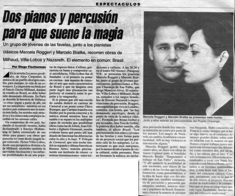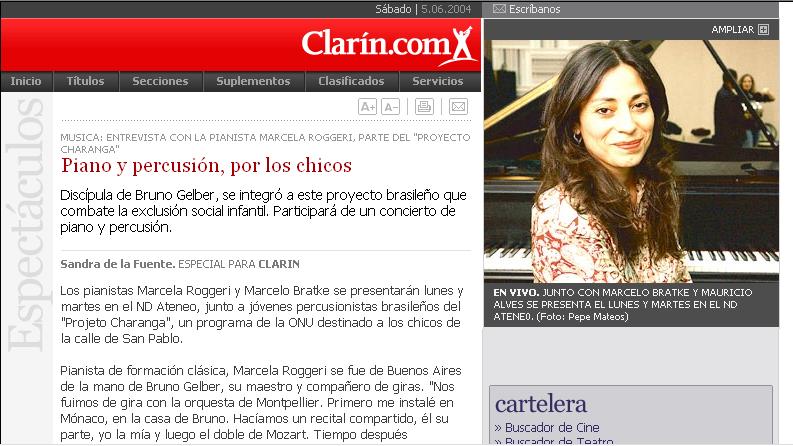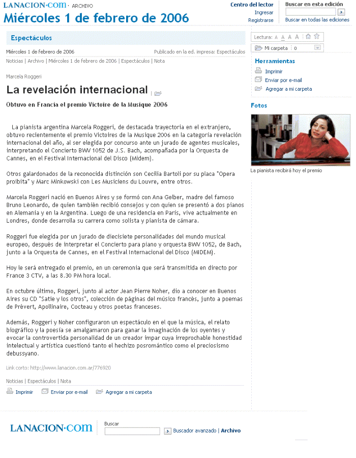 La pianista argentina Marcela Roggeri, de destacada trayectoria en el extranjero, obtuvo recientemente el premio Victoires de la Musique 2006 en la categoría revelación internacional del año, al ser elegida por concurso ante un jurado de agentes musicales, interpretando el Concierto BWV 1052 de J.S. Bach, acompañada por la Orquesta de Cannes, en el Festival Internacional del Disco (Midem).