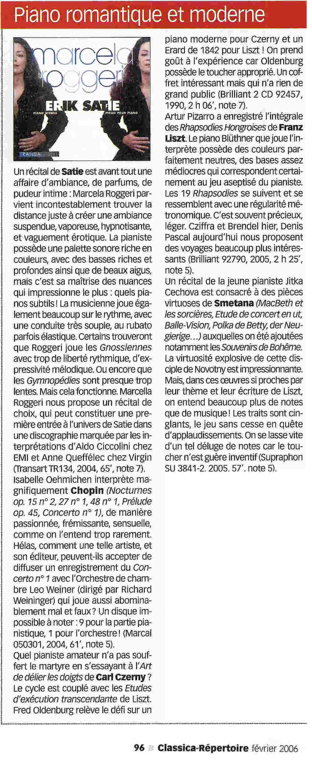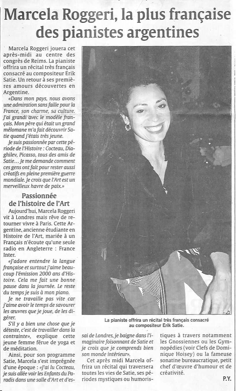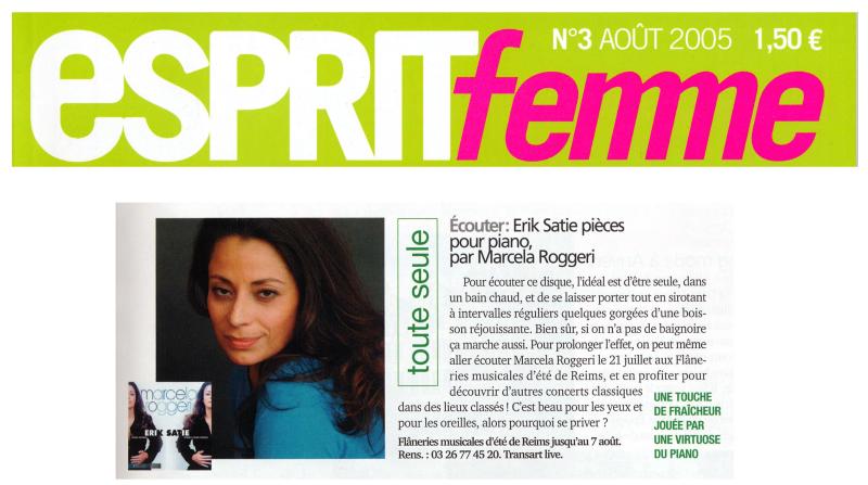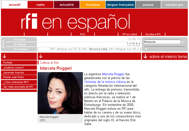 La argentina Marcela Roggeri fue galardonada con el premio de las Victorias de la música clásica en la categoría Revelación Internacional del año. La entrega de premios, transmitida en directo por la radio y televisión públicas francesas, se realizó el 1 de febrero en el Palacio de la Música de Estrasburgo. En noviembre de 2005, Marcela Roggeri estuvo en RFI para hablar de su carrera y de su nuevo disco, dedicado a uno de los compositores más originales del siglo XX, el francés Erik Satie.